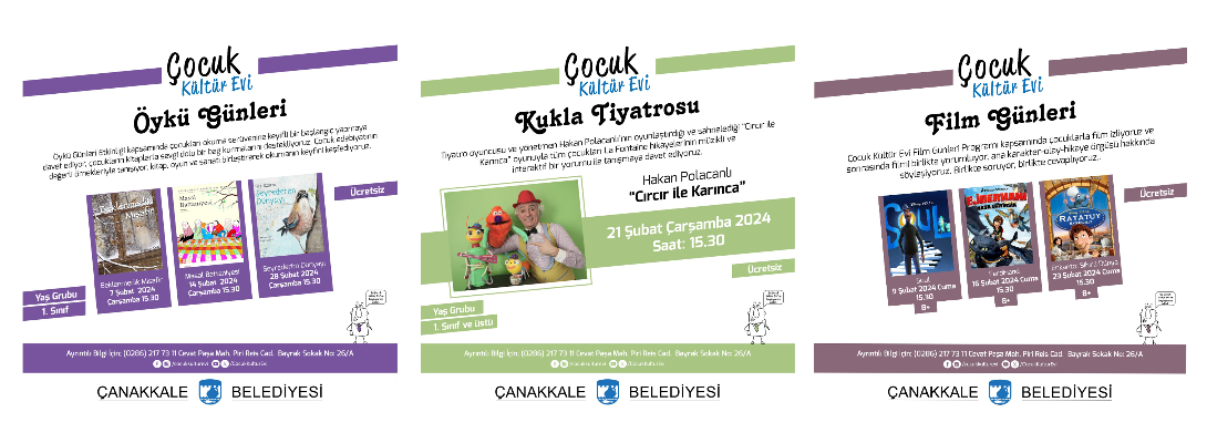 Çocukların kültürel, sanatsal ve sosyal gelişimlerini desteklemek amacıyla farklı disiplinlerden atölye ve etkinlik programları yürüten Çanakkale Belediyesi Çocuk Kültür Evi’nin “Film Günleri”nden “Öykü Günleri”ne ve “Kukla Tiyatrosu”na kadar pek çok renkli etkinliği içeren programı şubat ayında çocukları bekliyor.