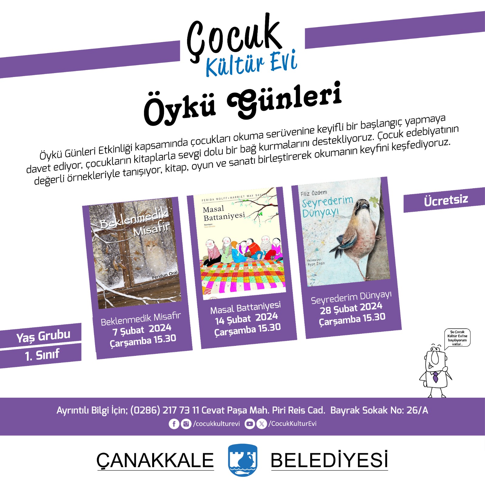 Çocukların erken yaşta kitap sevgisi edinmelerine ve edebiyatla nitelikli ilişki kurabilmelerine katkı sunan “Öykü Günleri” etkinliği kapsamında ise şubat ayı boyunca her çarşamba saat 15.30’da kitapseverler Çocuk Kültür Evi’nde konuk edilecek. 1. sınıfa devam eden çocukların katılımına açık olarak yürütülen etkinlik programı dahilinde, 7 Şubat 2024 Çarşamba günü saat 15.30’da “Beklenmedik Misafir” kitabı, 14 Şubat 2024 Çarşamba günü saat 15.30’da “Masal Battaniyesi” kitabı ve 28 Şubat 2024 Çarşamba günü saat 15.30’da “Seyrederim Dünyayı” kitabı çocuklarla paylaşılacak.