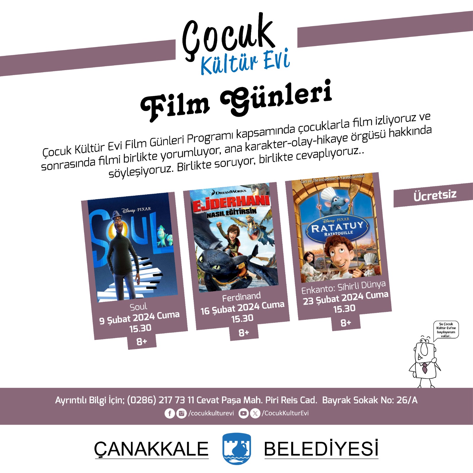 Her hafta çocuklarla birlikte film izlenip ardından bu filmin karakterlerinin, hikaye ve olay örgüsünün, müziğinin incelendiği bir film okuma atölyesi formatında yürütülen “Film Günleri” etkinliğinde şubat ayı boyunca her cuma saat 15.30’da sinefiller, Çocuk Kültür Evi’nde konuk edilecek. 8 yaş ve üzeri tüm çocukların katılımına açık olarak yürütülen etkinlik programı dahilinde 9 Şubat 2024 Cuma günü saat 15.30’da “Soul” filmi, 16 Şubat 2024 Cuma günü saat 15.30’da “Ejderhanı Nasıl Eğitirsin” filmi ve 23 Şubat 2024 Cuma günü saat 15.30’da “Ratatuy” filmi çocuklarla birlikte izlenerek incelenecek.