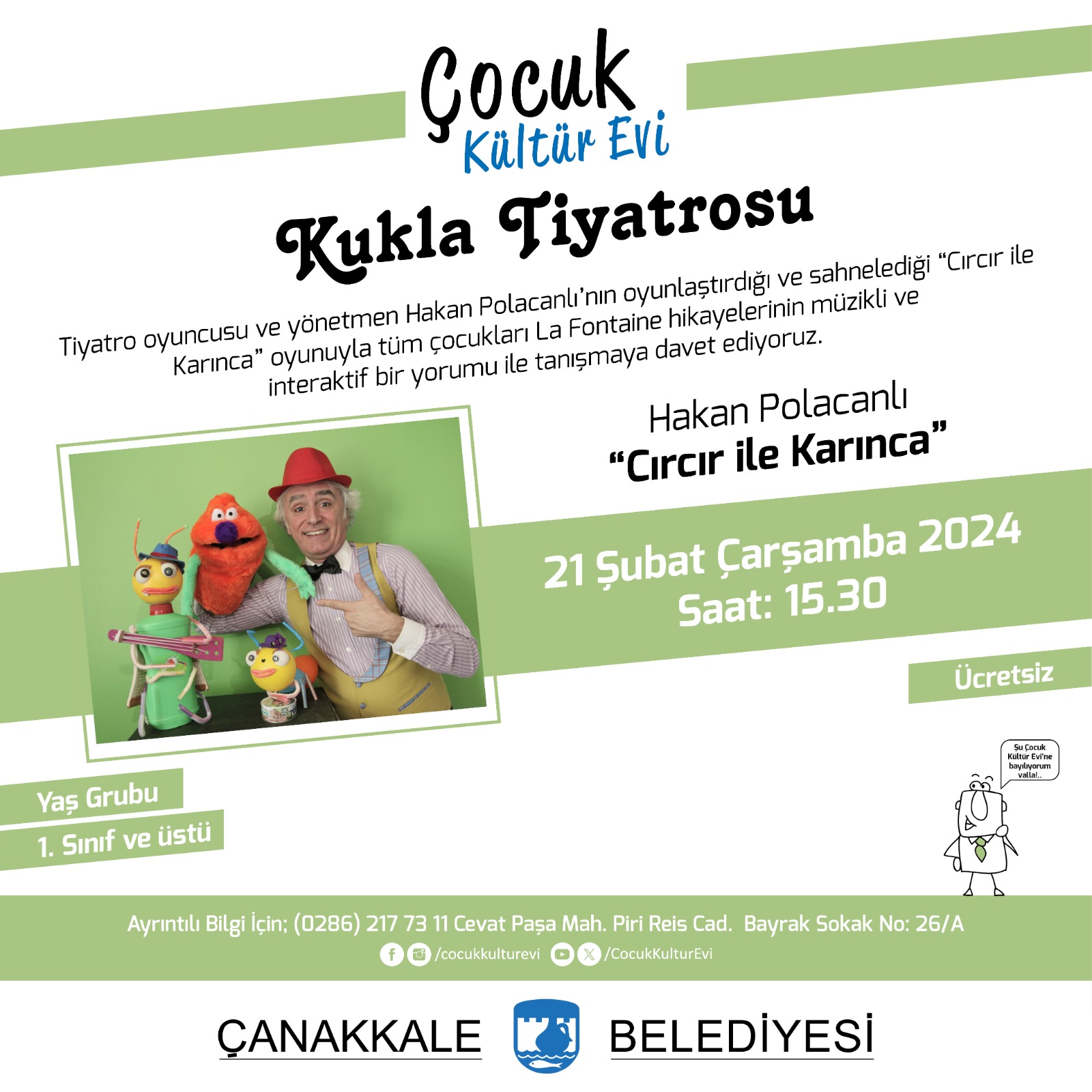Kültür Evi’nin programına bu yıl dahil ettiği bir diğer etkinlik olan, tiyatro oyuncusu ve yönetmen Hakan Polacanlı’nın oyunlaştırdığı ve sahneleyeceği " Cır Cır ile Karınca" isimli “Kukla Tiyatrosu” ise tüm çocukları La Fontaine hikayelerinin müzikli ve interaktif bir yorumu ile tanışma fırsatı verecek. 1. sınıf ve üstü tüm çocukların katılımına açık olarak yürütülen etkinlik, 21 Şubat 2024 Çarşamba günü saat 15.30’da Çocuk Kültür Evi’nde çocuklarla buluşacak.