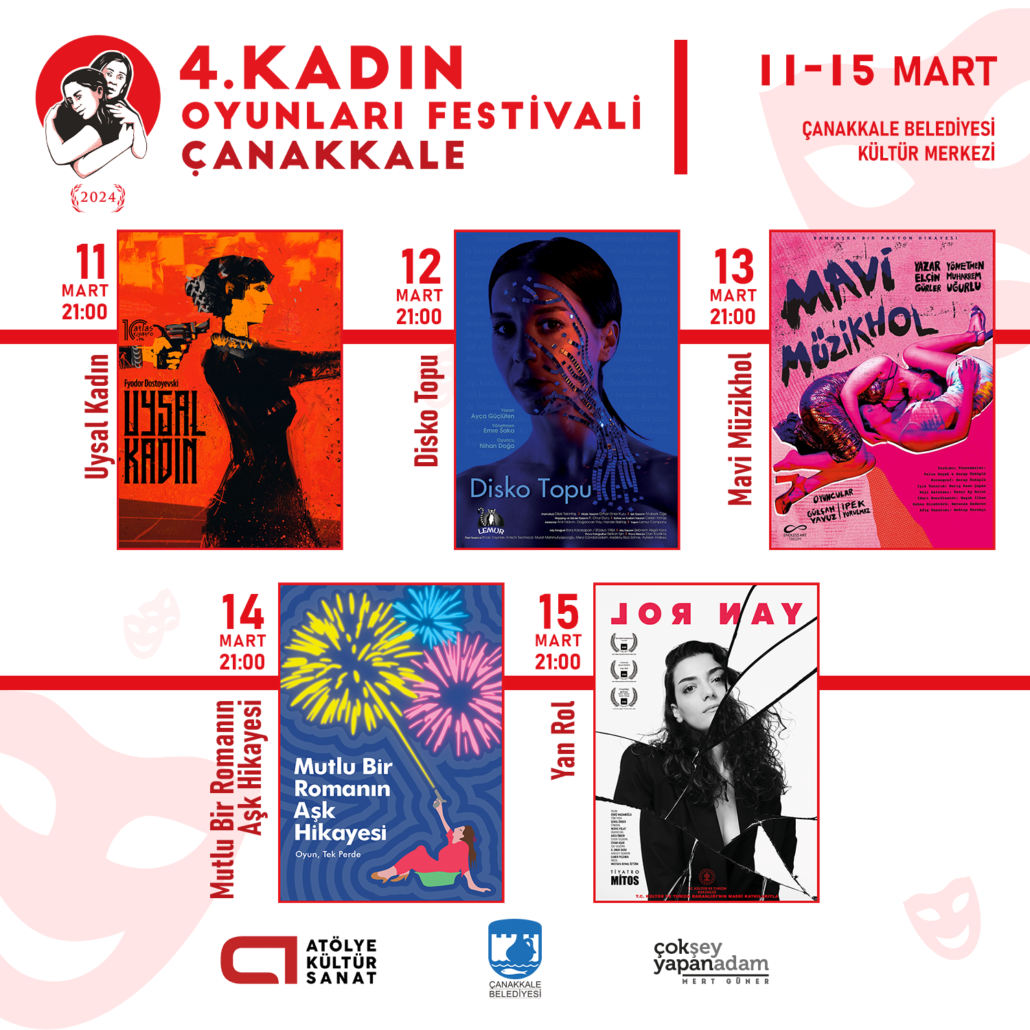 11 – 15 Mart 2024 tarihleri arasında Çanakkale Belediyesi Kültür Merkezi Salonu'nda sahnelenecek oyunlar ise şöyle; 11 Mart Pazartesi “Uysal Kadın”, 12 Mart Salı “Disko Topu”, 13 Mart Çarşamba “Mavi Müzikhol”, 14 Mart Perşembe “Mutlu Bir Romanın Aşk Hikâyesi” ve 15 Mart Cuma “Yan Rol”. Saat 21.00'de başlayacak olan oyunlara girişler ücretsiz ve davetiyesiz olacak.