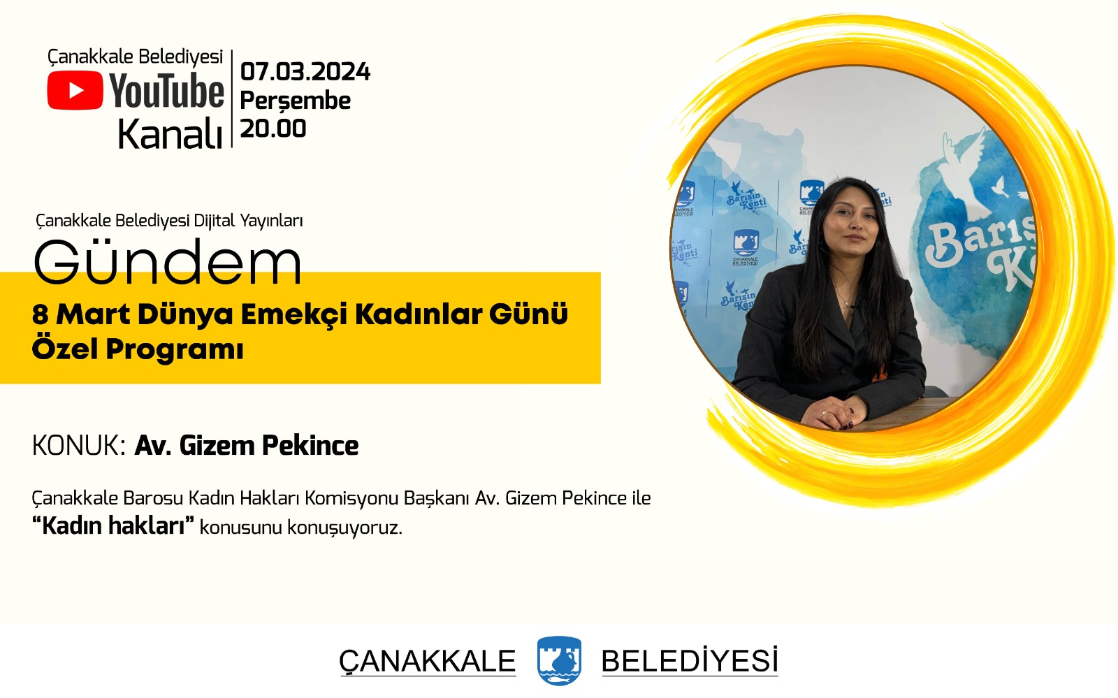 Çanakkale Belediyesi dijital yayınlarının 8 Mart Dünya Emekçi Kadınlar Gününe özel olarak hazırlanan programının konuğu Av. Gizem Pekince oldu.