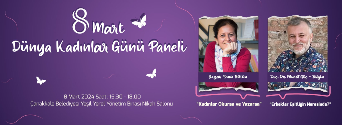 8 Mart 2024 Cuma günü Çanakkale Belediyesi Yeşil Yerel Yönetim Binası Nikah Salonunda 15.30-18.00 saatleri arasında gerçekleşecek olan panele, Yazar Onur Bütün “Kadınlar Okursa ve Yazarsa” başlıklı sunumu, Doç. Dr. Murat Göç-Bilgin ise “Erkekler Eşitliğin Neresinde?” başlıklı sunumu ile katılacak.