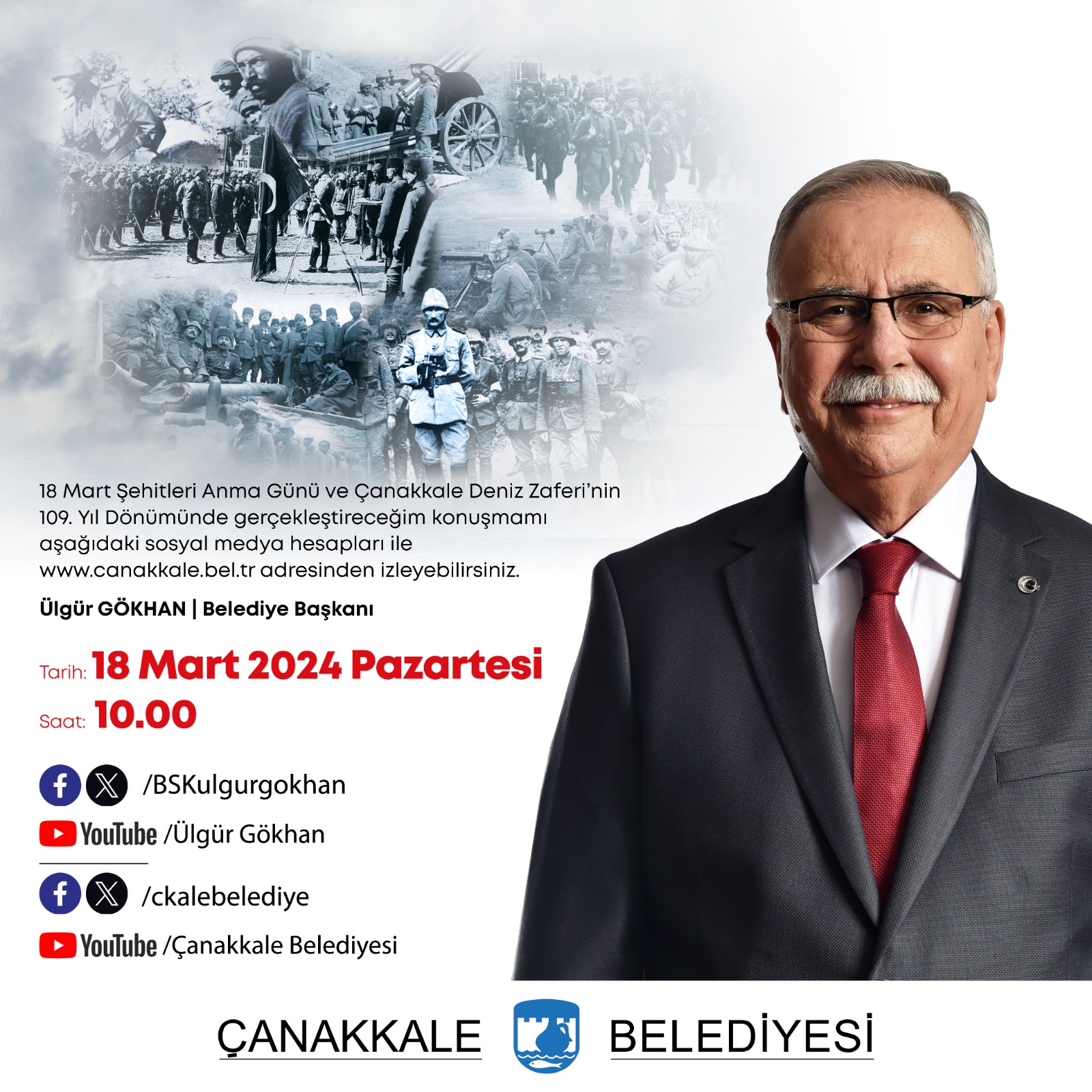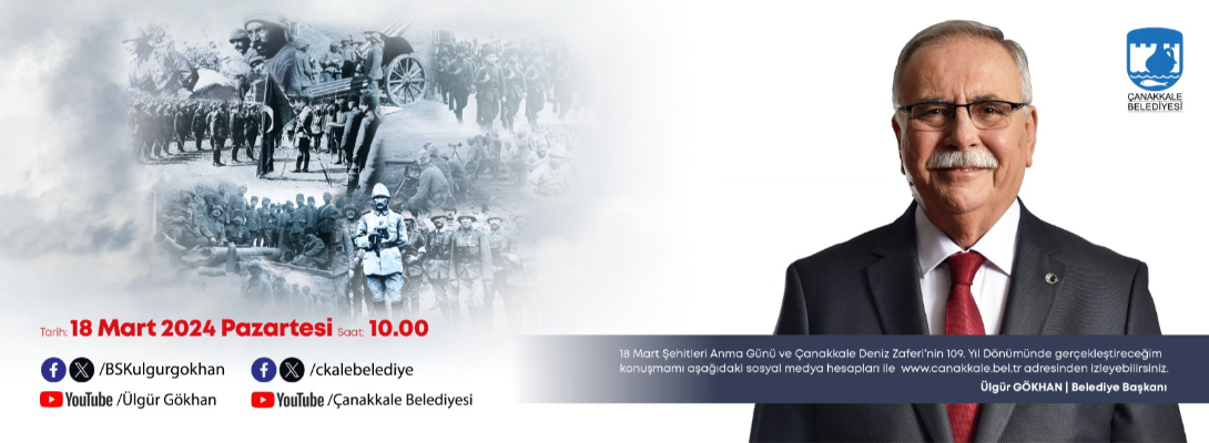 Belediye Başkanı Sayın Ülgür Gökhan'ın 18 Mart Şehitleri Anma Günü ve Çanakkale Deniz Zaferi'nin 109. Yıldönümü konuşmasını, 18 Mart 2024 Pazartesi günü saat 10.00'da sosyal medya hesaplarımızdan ve belediyemiz web sitesinden izleyebilirsiniz.