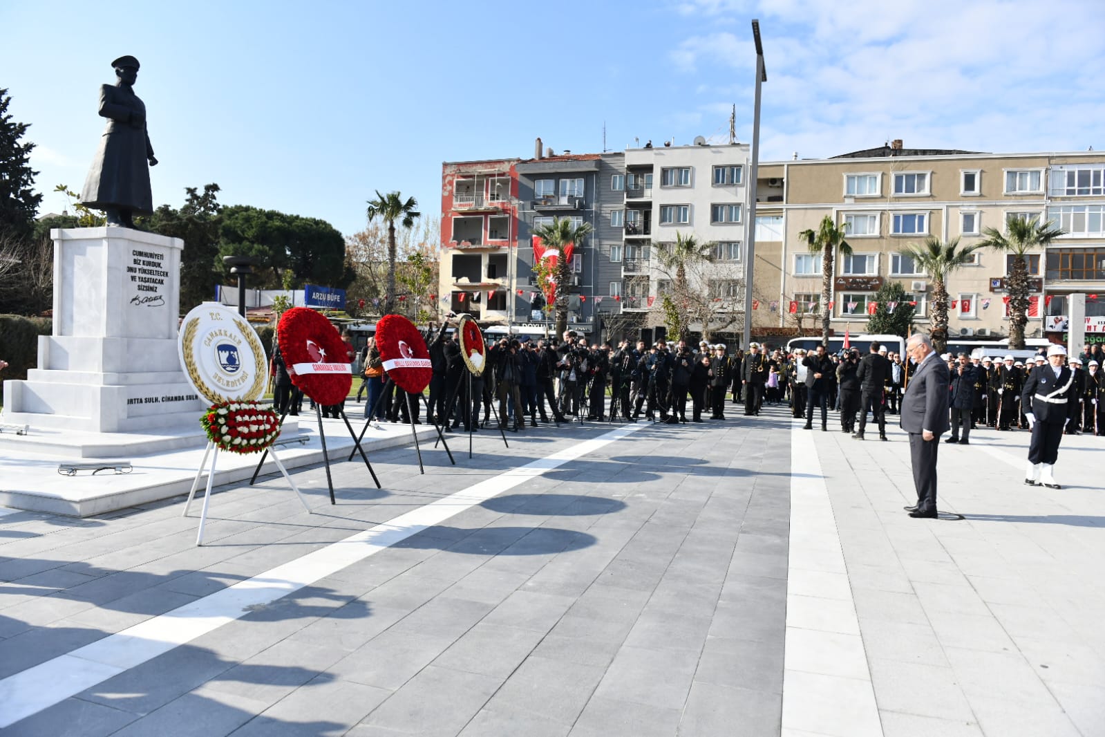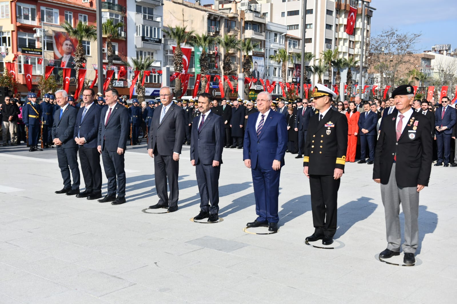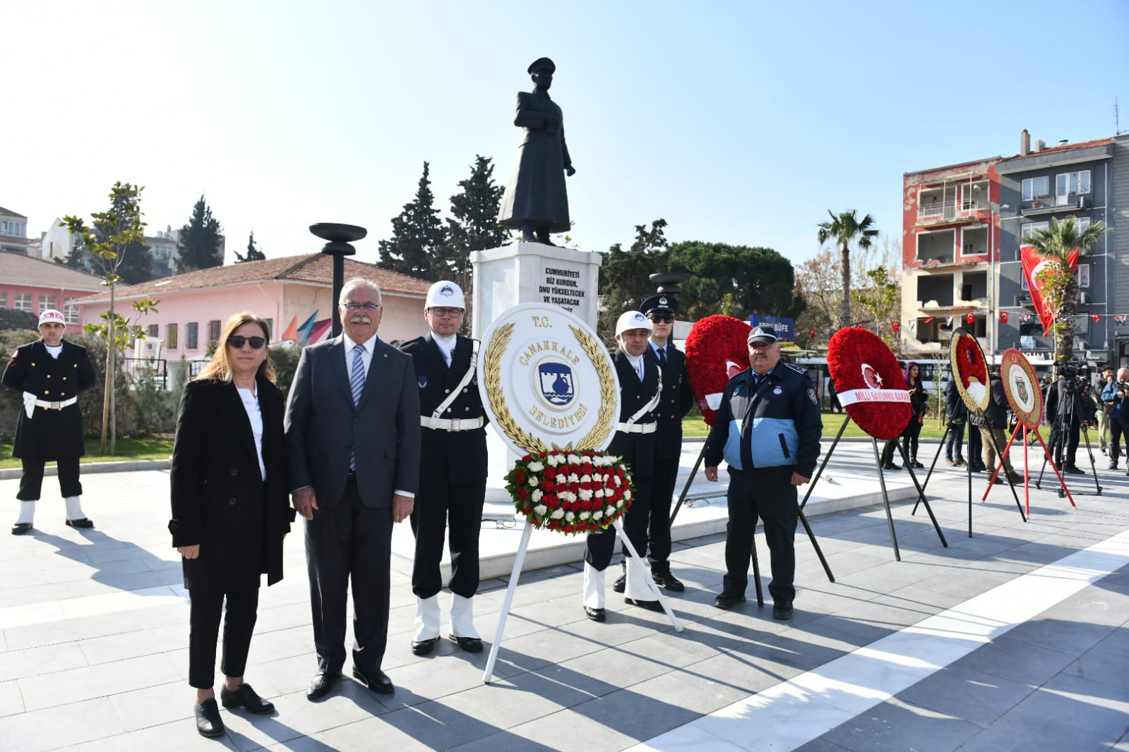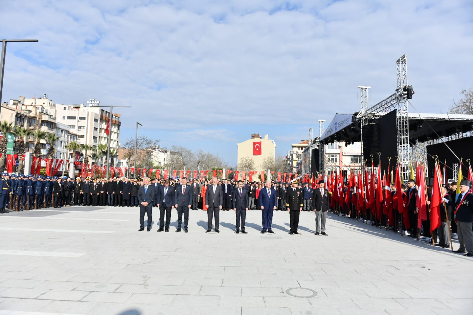Cumhuriyet Meydanı'nda düzenlenen törene Milli Savunma Bakanı Yaşar Güler, Çanakkale Valisi İlhami Aktaş, Boğaz ve Garnizon Komutanı Tuğamiral Mustafa Biçen, Belediye Başkanı Ülgür Gökhan, CHP Çanakkale Milletvekilleri İsmet Güneşhan ve Özgür Ceylan, İyi Parti Çanakkale Milletvekili Rıdvan Uz başta olmak üzere sivil ve askeri protokol üyeleri, kurum ve kuruluş temsilcileri, kentliler ile öğrenciler katıldı.