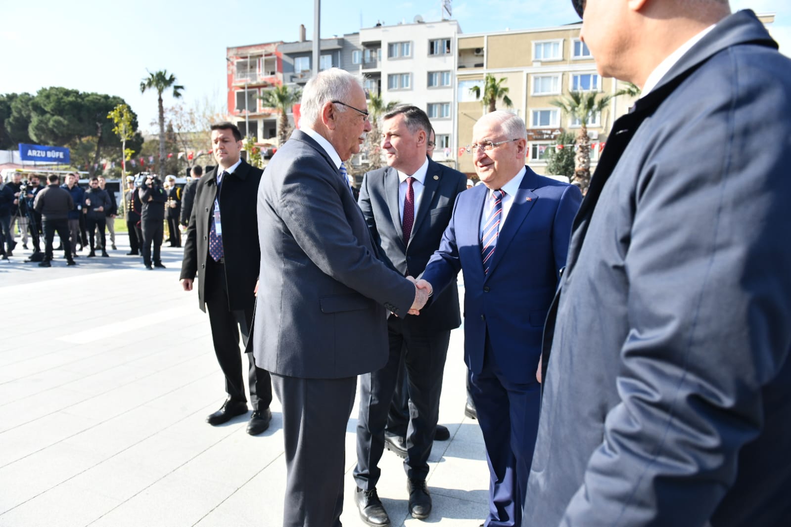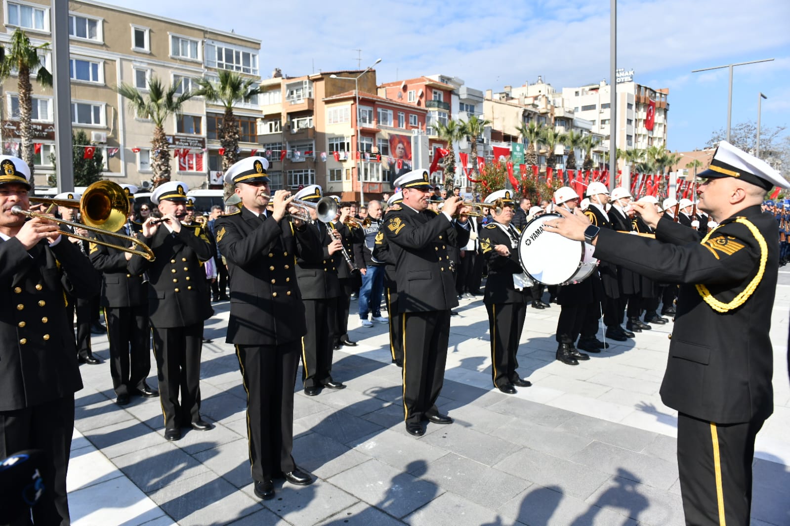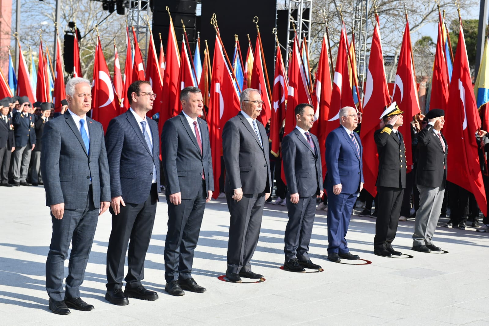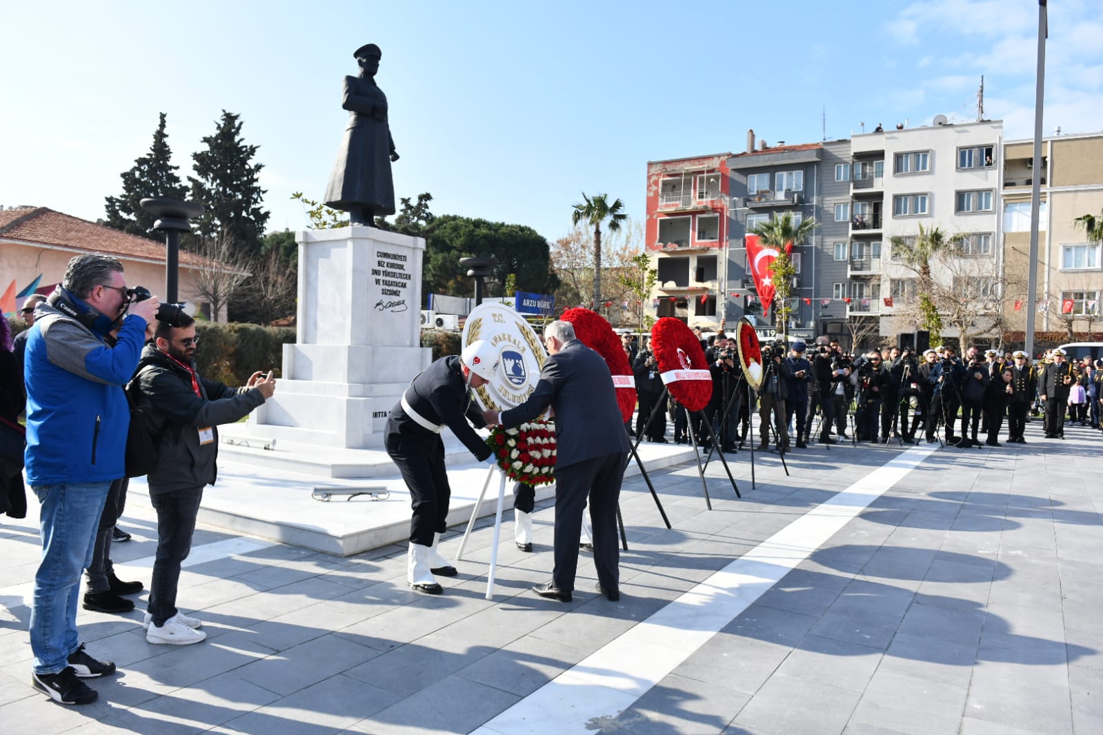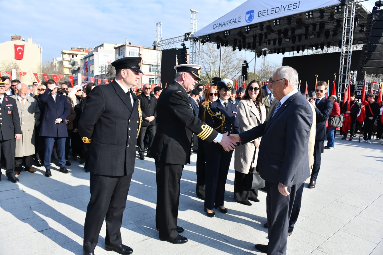 Cumhuriyet Meydanı'nda düzenlenen törene Milli Savunma Bakanı Yaşar Güler, Çanakkale Valisi İlhami Aktaş, Boğaz ve Garnizon Komutanı Tuğamiral Mustafa Biçen, Belediye Başkanı Ülgür Gökhan, CHP Çanakkale Milletvekilleri İsmet Güneşhan ve Özgür Ceylan, İyi Parti Çanakkale Milletvekili Rıdvan Uz başta olmak üzere sivil ve askeri protokol üyeleri, kurum ve kuruluş temsilcileri, kentliler ile öğrenciler katıldı.