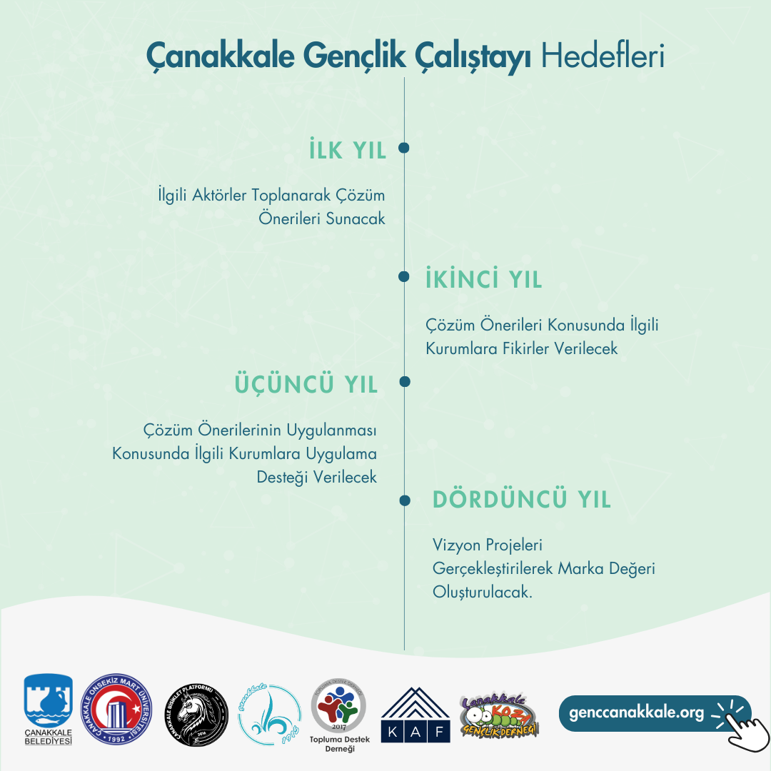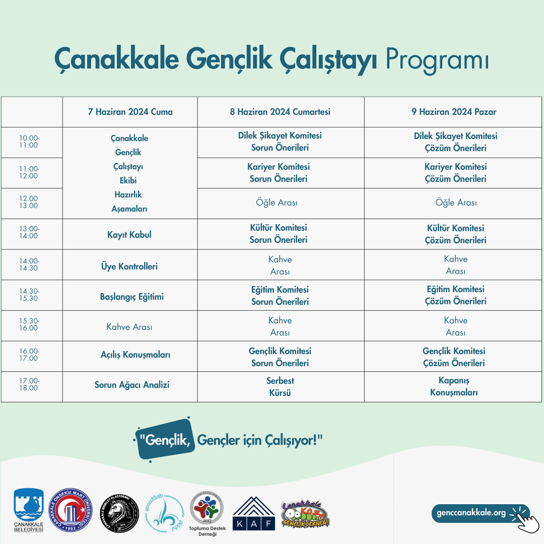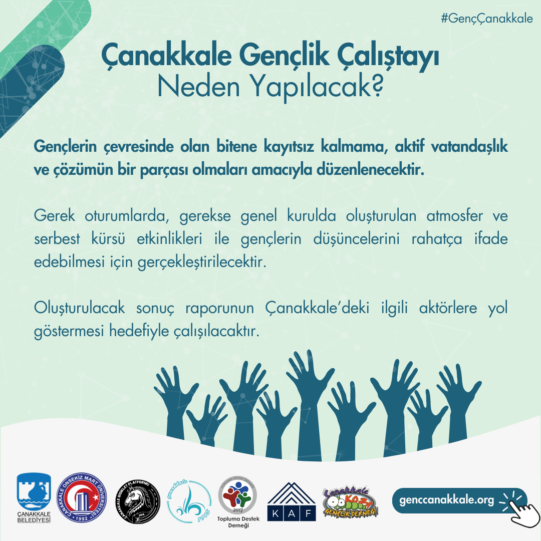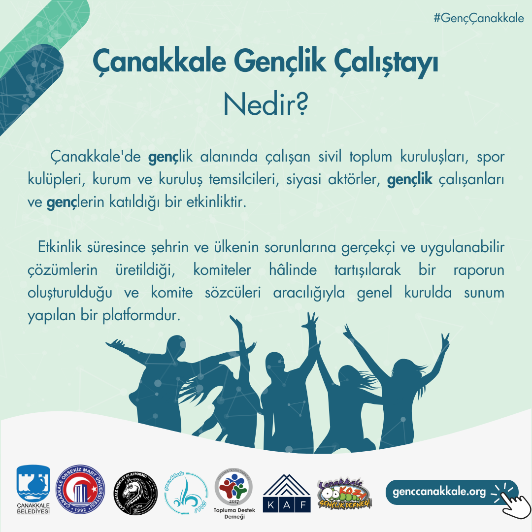Çanakkale'de yaşayan 15-30 yaş arasındaki gençlerin; eğitim, gençlik, kariyer, dilek-şikayet ve kültür alt başlıklarında yaşadıkları sorunlara, yapıcı çözüm önerileri sunmasıyla gerçekleşecek Çanakkale Gençlik Çalıştayı, gençleri bekliyor.