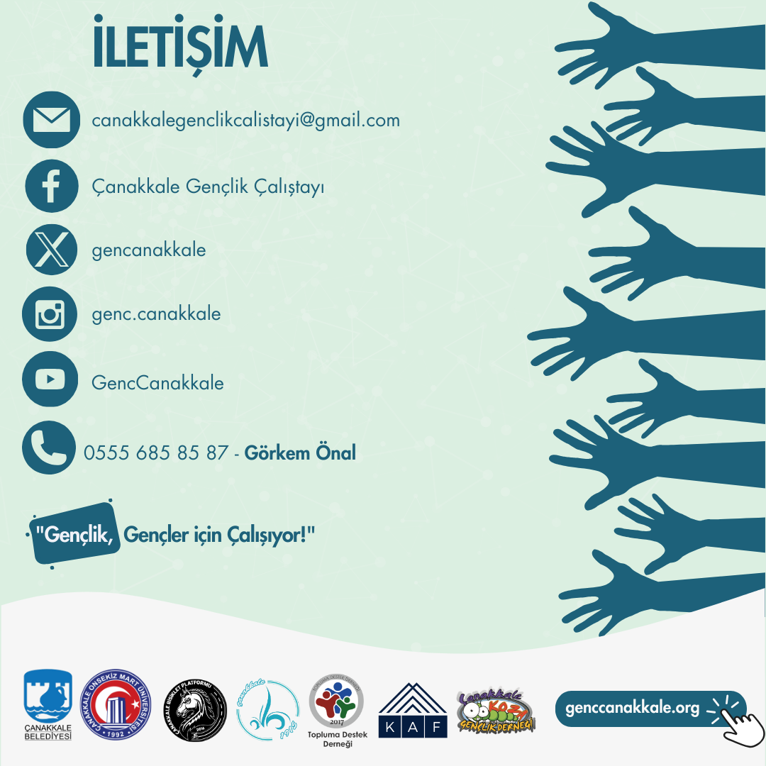 Sorularınız için @genc.canakkale Instagram hesabını takip edebilir veya @genc.canakkale Instagram hesabında paylaşılan whatsapp bilgilendirme grubu bağlantısına tıklayarak çalıştay ekibine ulaşabilirsiniz.