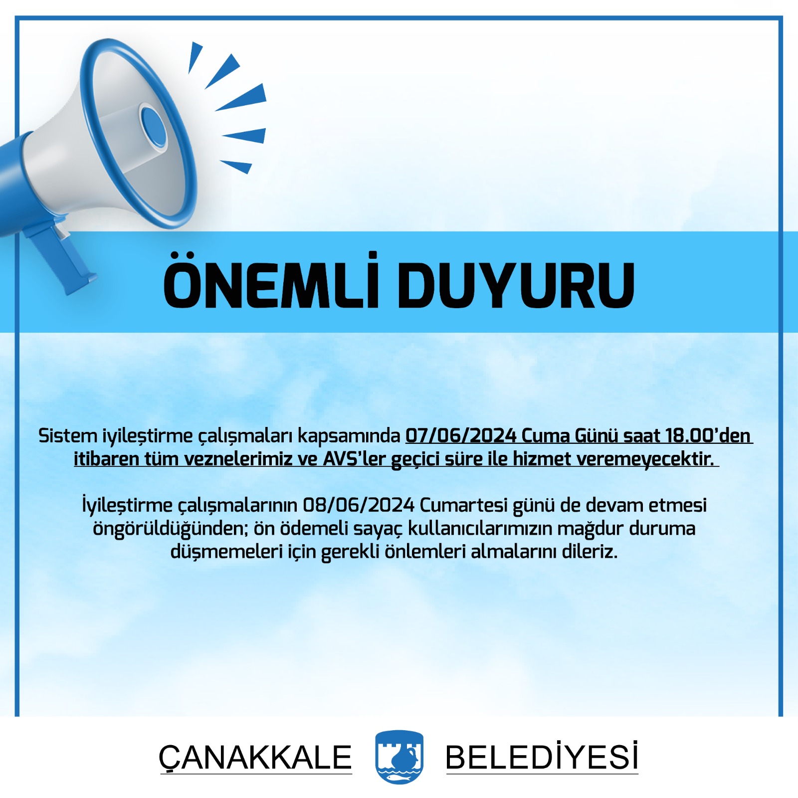 İyileştirme çalışmalarının 8 Haziran 2024 Cumartesi günü de devam etmesi öngörüldüğünden; ön ödemeli sayaç kullanıcılarımızın mağdur duruma düşmemeleri için gerekli önlemleri almalarını dileriz.
