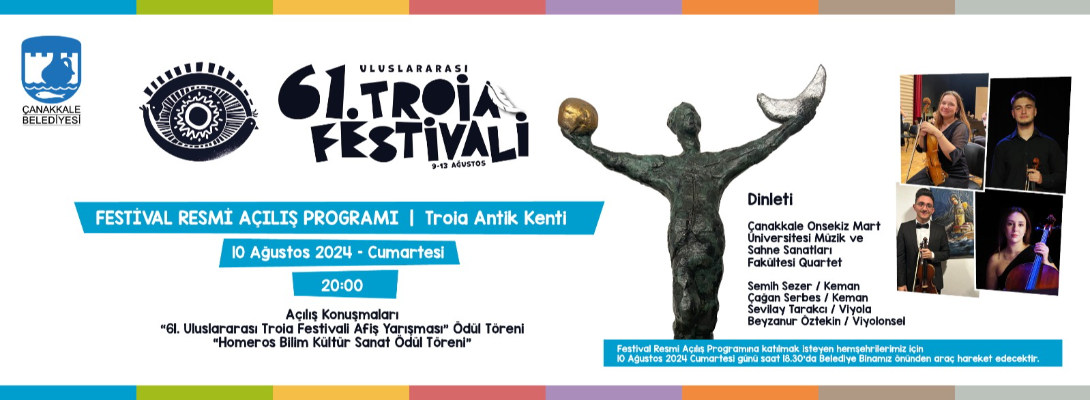 Konser, tiyatro, dans gösterileri, sergi, atölye, söyleşi, spor faaliyetleri ve çocuk oyunları gibi çeşitli etkinliklerin yer alacağı 61. Uluslararası Troia Festivali'nin resmi açılış töreni 10 Ağustos Cumartesi günü Troia Ören Yerinde gerçekleşecek. Resmi açılış programında, Festivalin simgelerinden olan Homeros Bilim, Kültür ve Sanat Ödülünün de takdimi gerçekleşecek. Başlıca; tarih alanındaki çalışmaları, tarih biliminin yaygınlaştırılması ve her yaştan kişi tarafından sevilir kılınması adına çabaları nedeniyle bu seneki ödül, Belediye Başkanımız Muharrem Erkek tarafından Prof. Dr. İlber Ortaylı'ya verilecek.