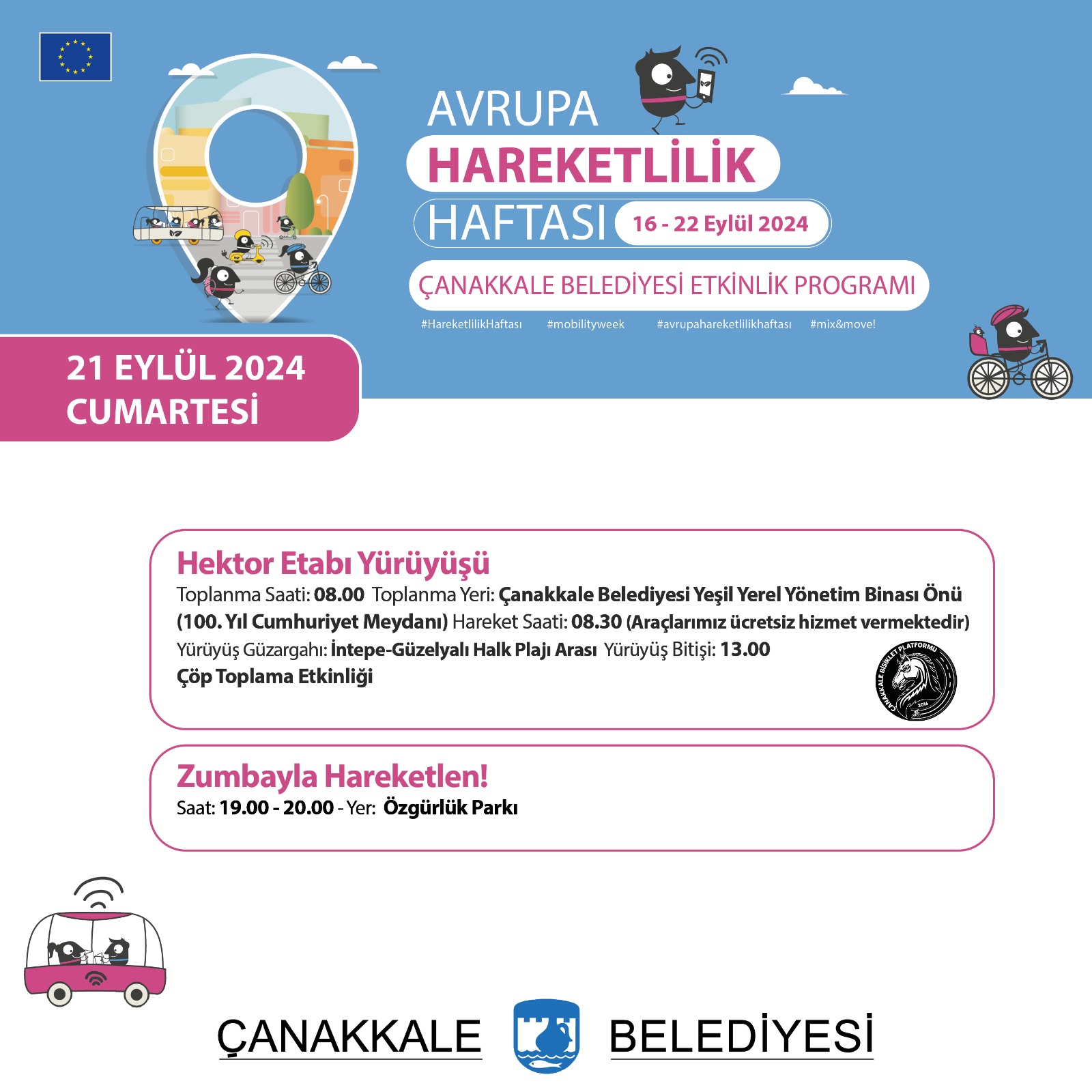 Bu yıl “Paylaşımlı Kamusal Alanlar” teması ile 16-22 Eylül 2024 tarihleri arasında gerçekleştirilecek Avrupa Hareketlilik Haftası etkinliklerine Çanakkale Belediyesi de; “Yürüyelim Arkadaşlar Hafta Başlangıç Yürüyüşü, Ergometre, Futbol Turnuvası, Basketbol 3 Sayı Yarışması, Çanakkale Boğazgücü Engelliler Gençlik ve Spor Kulübü Gösteri Maçı, Sağlık için Hareket, Hareket için Bisiklet Bisikletli Ulaşım, Güvenli Sürüş ve Bisiklet Çeşitleri Ata'm Kreş Sunumu, Nefes Egzersizi, Yoga, Zumbayla Hareketlen Etkinlikleriyle, Hektor Etabı Doğa Yürüyüşü, Bisiklet Turu” ve “Otomobilsiz Gün” etkinlikleri ile katılacak.