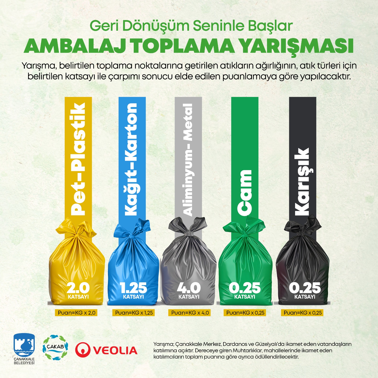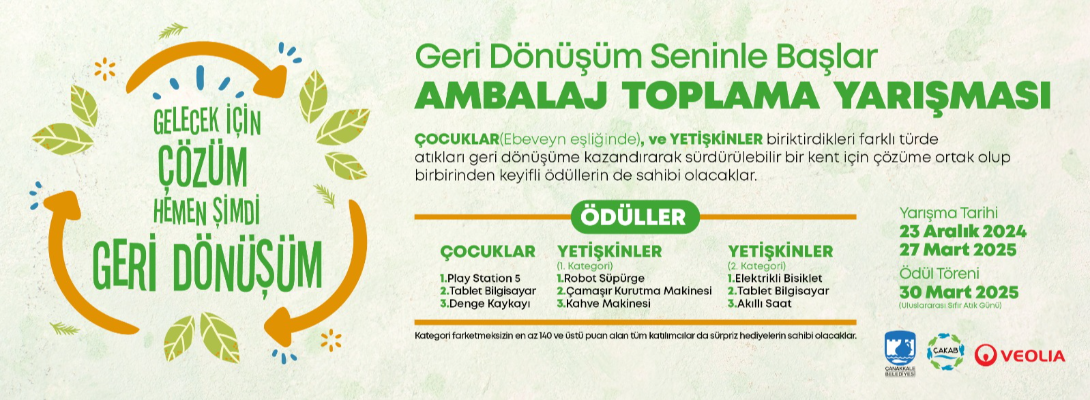 Çanakkale Belediyesi, Çanakkale Katı Atık Yönetim Birliği (ÇAKAB) ve Veolia Çanakkale Atık Hizmetleri A.Ş ortaklığı ile çevre bilincini ve geri dönüşüm süreçlerine katılımı artırmak amacıyla "Geri Dönüşüm Seninle Başlar" isimli ÖDÜLLÜ Ambalaj Toplama Yarışmasını hemşehrilerimizin katılımına açıyor.