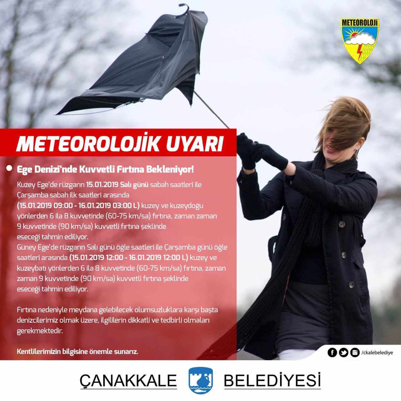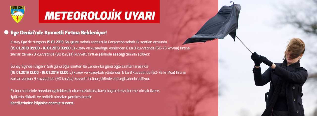 Kuzey Ege'de rüzgarın 15.01.2019 Salı günü sabah saatleri ile Çarşamba sabah ilk saatleri arasında (15.01.2019 09:00 - 16.01.2019 03:00 L) kuzey ve kuzeydoğu yönlerden 6 ila 8 kuvvetinde (60-75 km/sa) fırtına, zaman zaman 9 kuvvetinde (90 km/sa) kuvvetli fırtına şeklinde eseceği tahmin ediliyor.