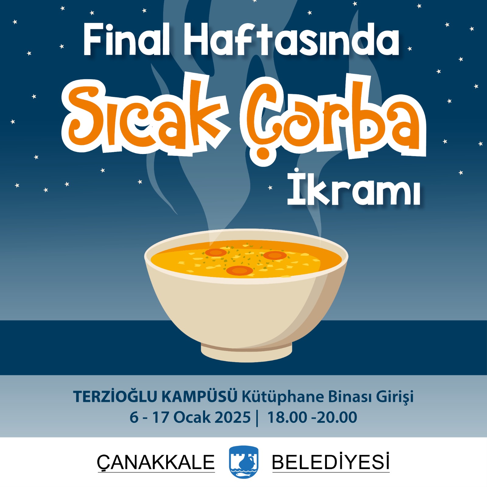 Çanakkale Onsekiz Mart Üniversitesinde öğrenim gören öğrencilerimizin final haftalarında keyifli bir mola vermeleri için düzenlenen sıcak çorba ikramları; 6-17 Ocak 2025 tarihlerinde, 18.00 – 20.00 saatleri arasında ÇOMÜ Terzioğlu Kampüsü Kütüphane Binası girişinde gerçekleşecek.