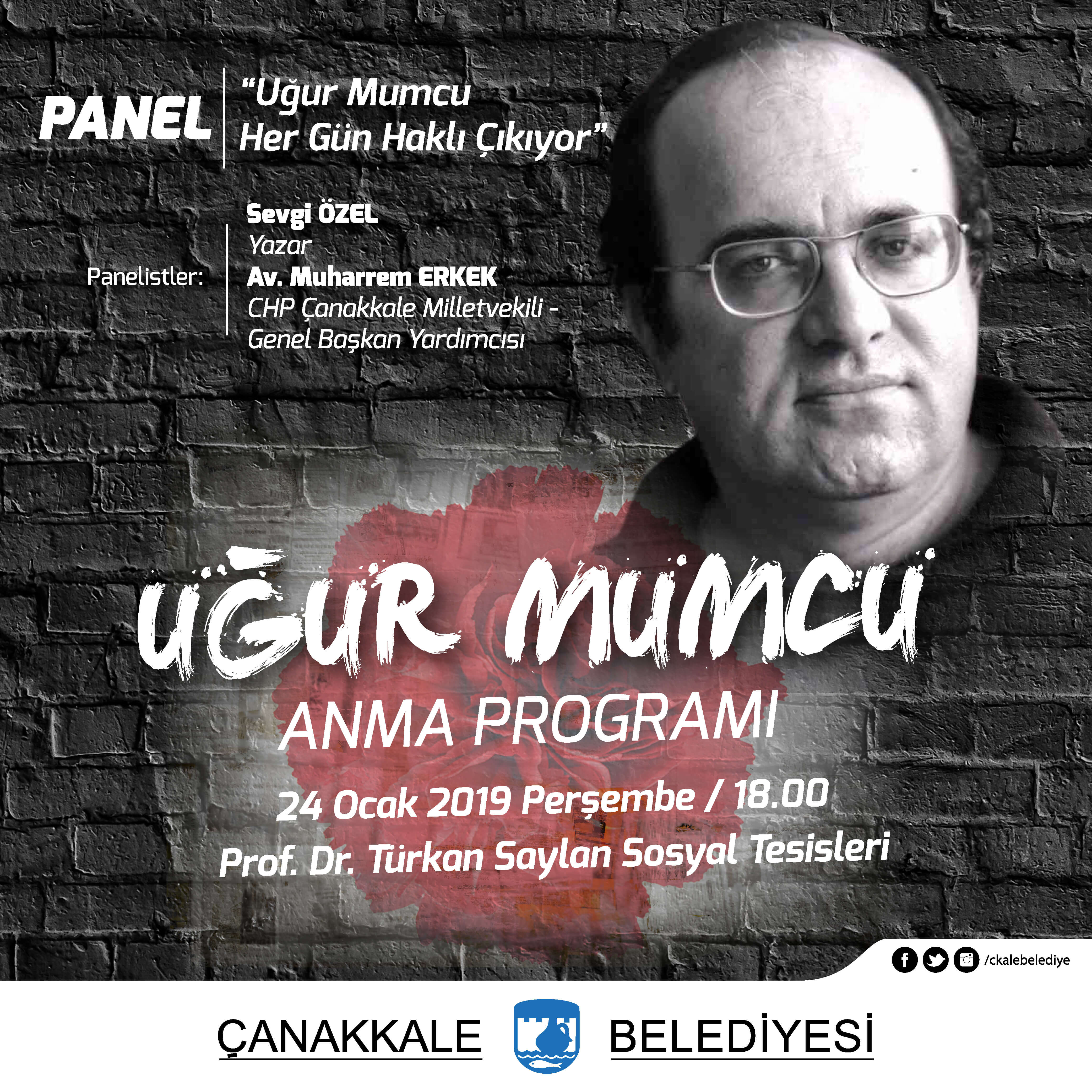 Çanakkale Belediyesi tarafından düzenlenen “Uğur Mumcu Her Gün Haklı Çıkıyor” başlıklı panele yazar Sevgi Özel ile Cumhuriyet Halk Partisi Genel Başkan Yardımcısı ve Çanakkale Milletvekili Av. Muharrem Erkek konuşmacı olarak katılacak.