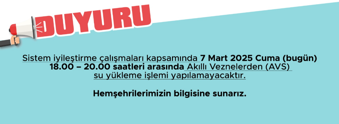 Sistem iyileştirme çalışmaları kapsamında 7 Mart 2025 Cuma (bugün) 18.00 – 20.00 saatleri arasında Akıllı Veznelerden (AVS) su yükleme işlemi yapılamayacaktır.