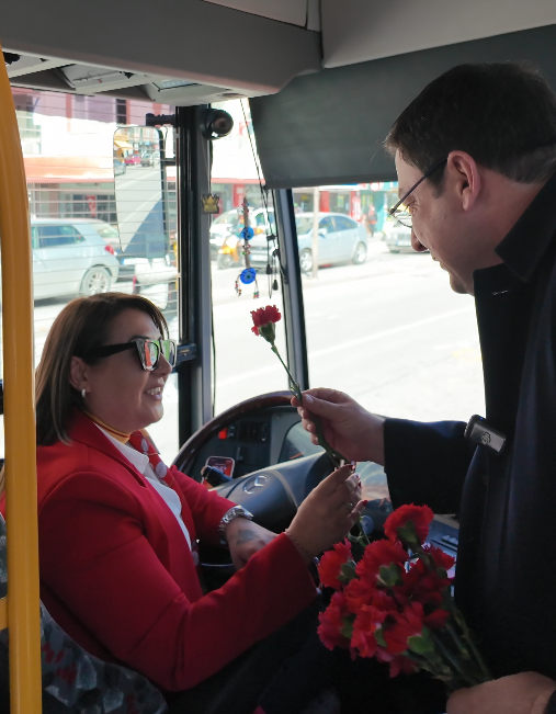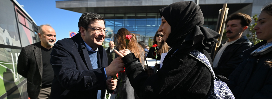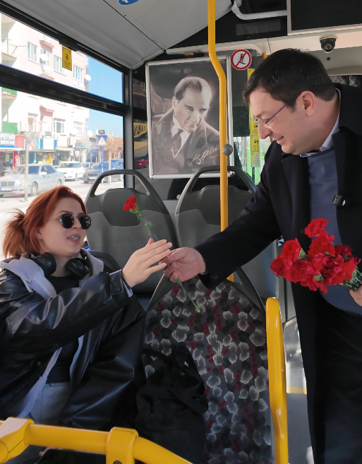 Çanakkale Belediye Başkanı Muharrem Erkek, 8 Mart Dünya Kadınlar Günü'nde görevi başında olan otobüs şoförü Yeliz Tez'e çiçek takdiminde bulundu.