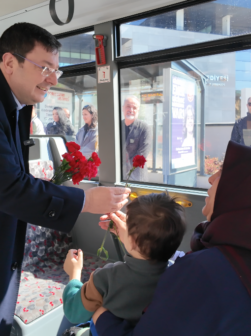 Başkan Erkek, Ulaşım Hizmetleri Müdürlüğünde görevli şoför Yeliz Tez'i kullandığı otobüste ziyaret etti. Başkan Erkek, 8 Mart Dünya Kadınlar Günü'nde kendi isteğiyle görevde olmasından dolayı tebrik ettiği Tez'e hem çiçek takdiminde bulundu hem de Kadınlar Günü'nü kutladı. Başkan Erkek ayrıca, otobüste ve durakta bulunan kadınlara da çiçek takdiminde bulundu.