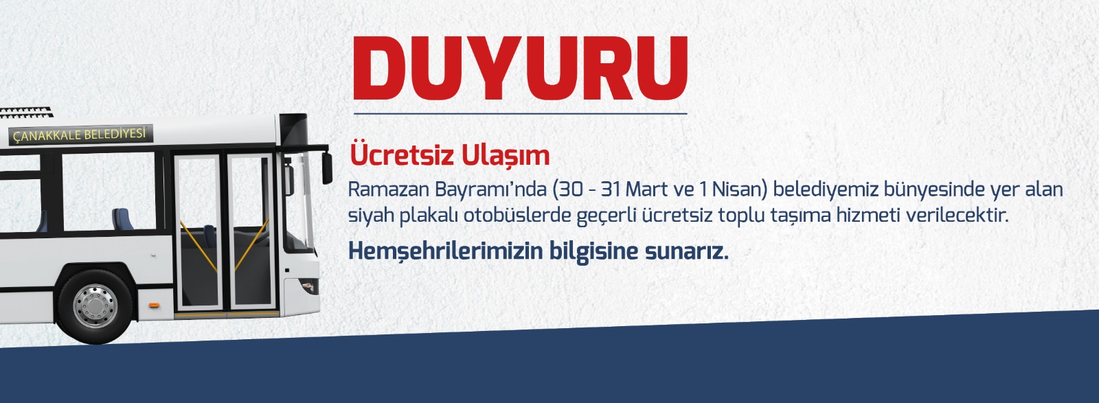 Ramazan Bayramı'nda (30-31 Mart ve 1 Nisan) belediyemiz bünyesinde yer alan siyah plakalı otobüslerde geçerli ücretsiz toplu taşıma hizmeti verilecektir.