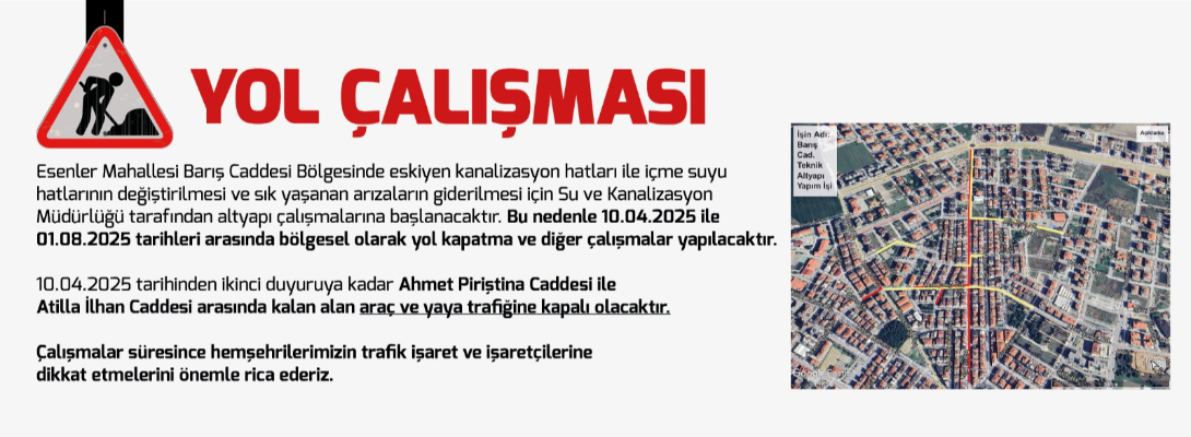 Esenler Mahallesi Barış Caddesi Bölgesinde eskiyen kanalizasyon hatları ile içme suyu hatlarının değiştirilmesi ve sık yaşanan arızaların giderilmesi için Su ve Kanalizasyon Müdürlüğü tarafından altyapı çalışmalarına başlanacaktır. Bu nedenle 10.04.2025 ile 01.08.2025 tarihleri arasında bölgesel olarak yol kapatma ve diğer çalışmalar yapılacaktır.