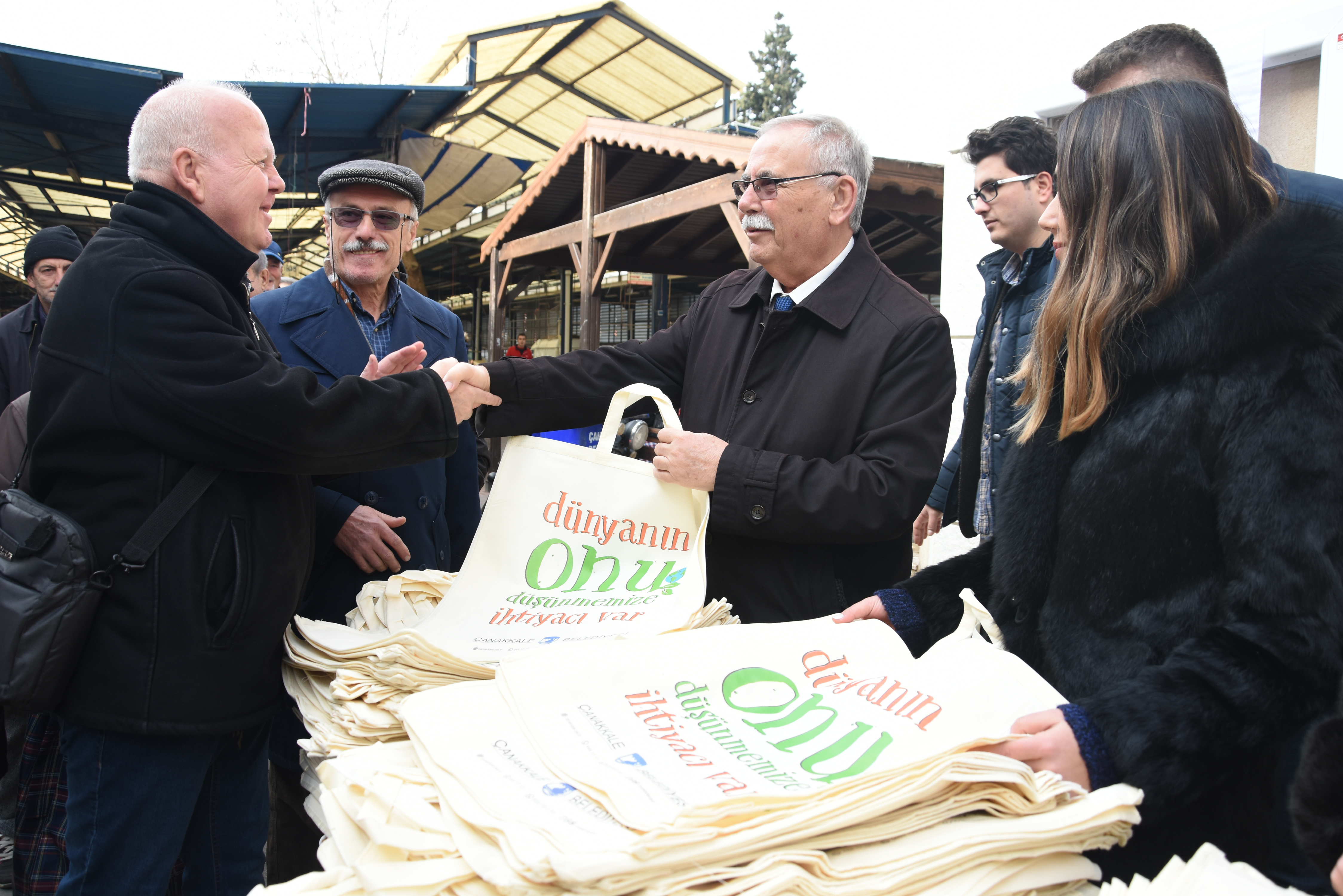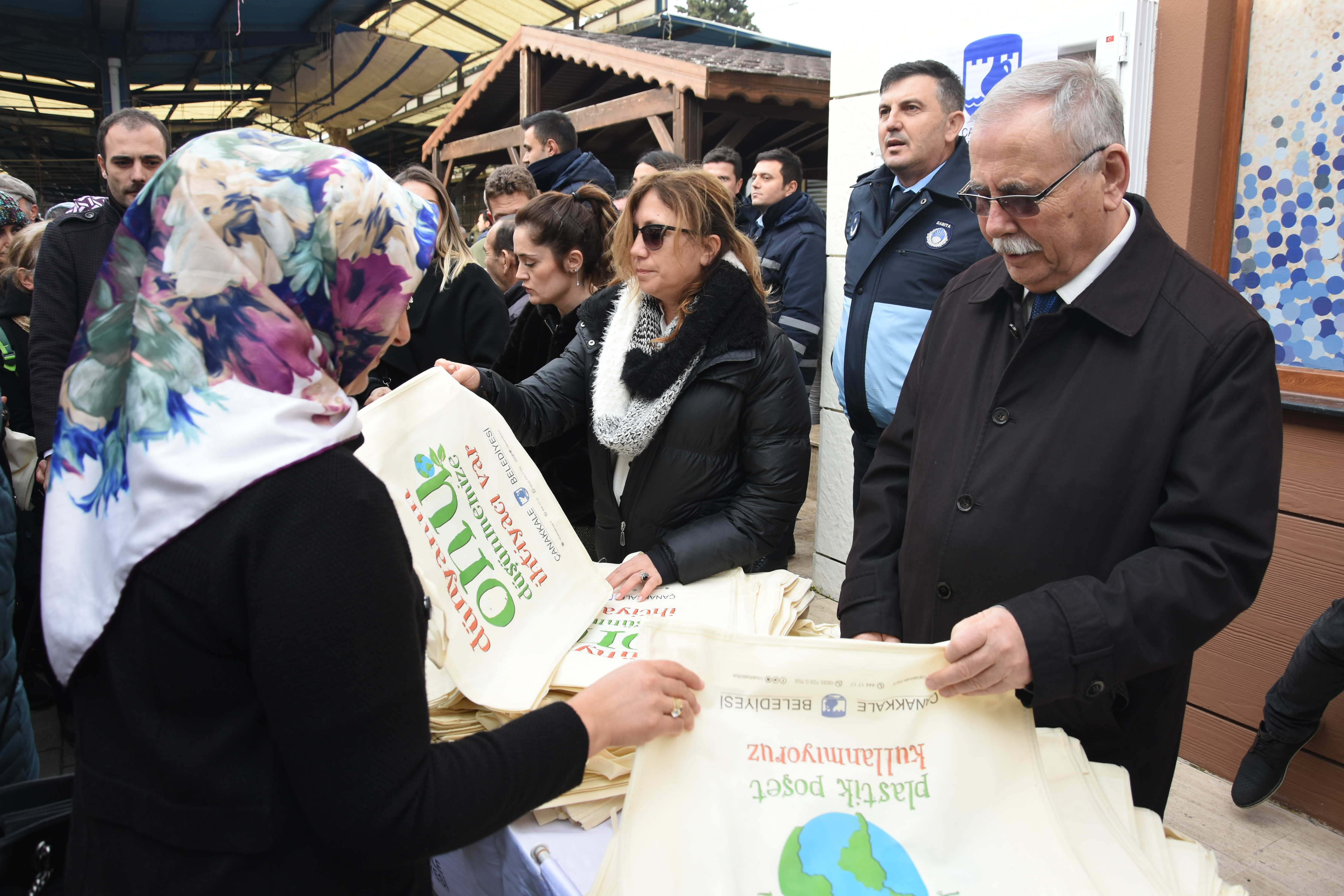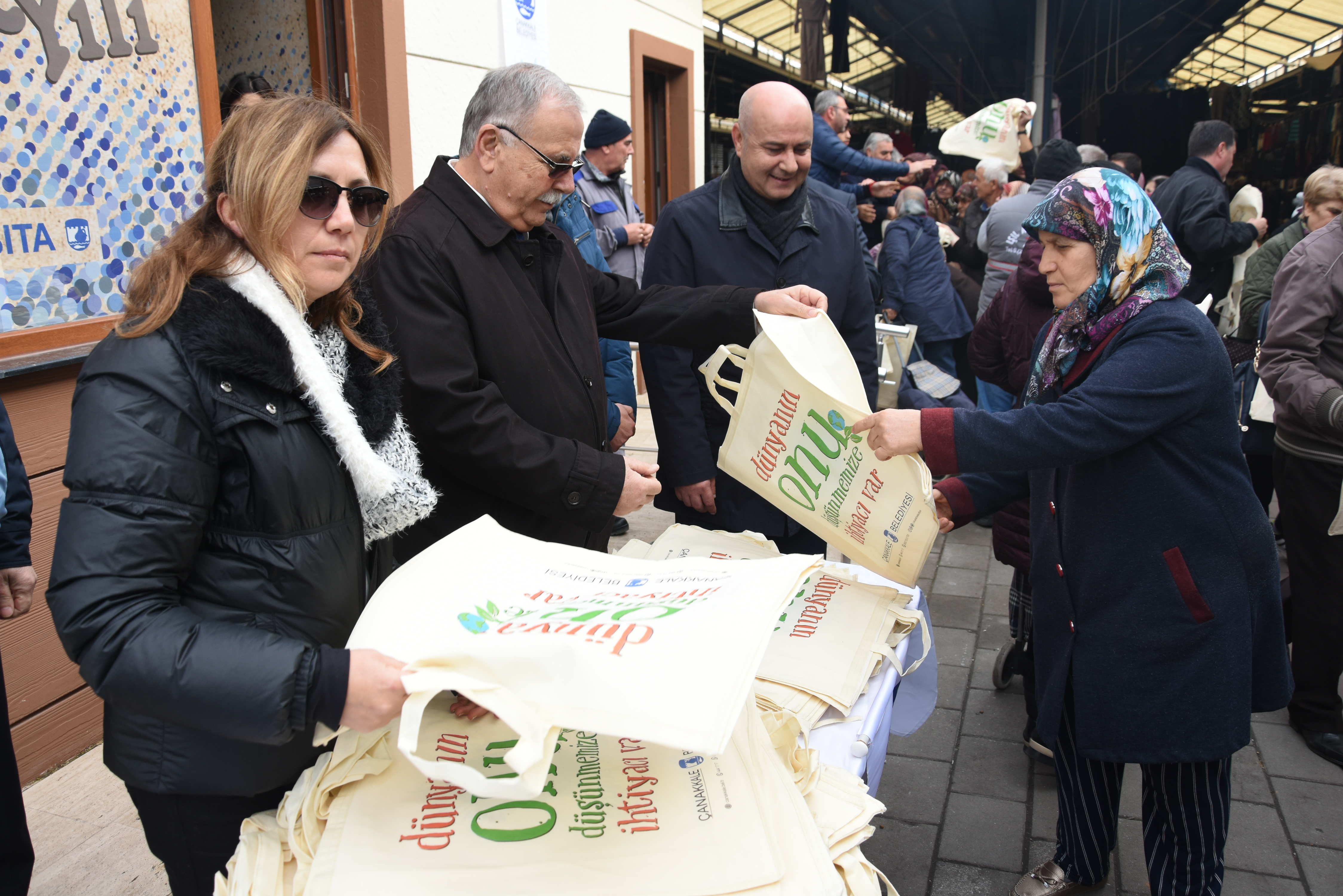 Çanakkale Belediyesi tarafından çevre ve doğaya saygı kapsamında plastik poşetlerin kullanımını en aza indirmeye yönelik farkındalık yaratmak amacıyla hazırlanan doğa dostu bez çantalar 22 Ocak 2019 Salı günü Pazar Yerinde kentlilere dağıtıldı.