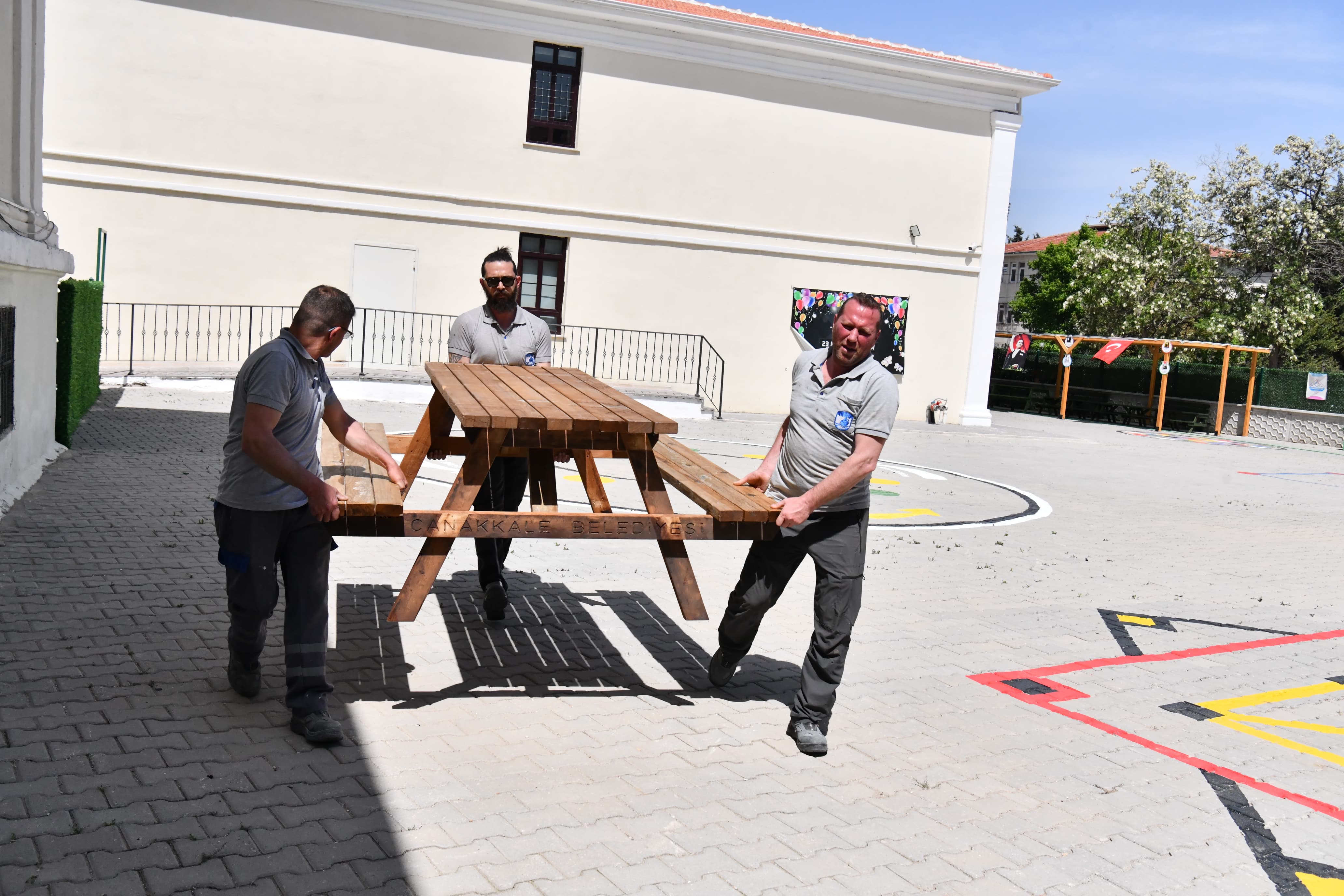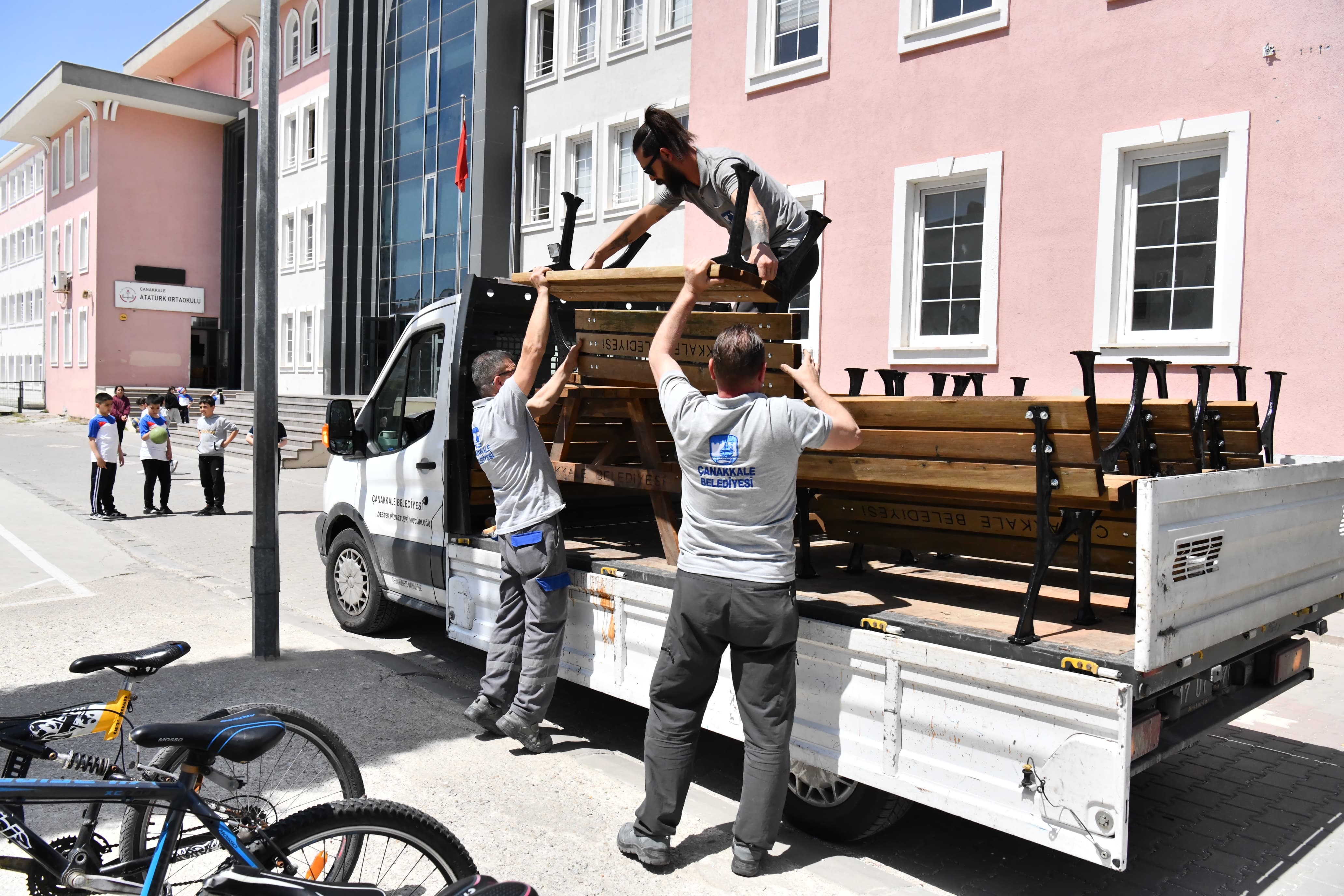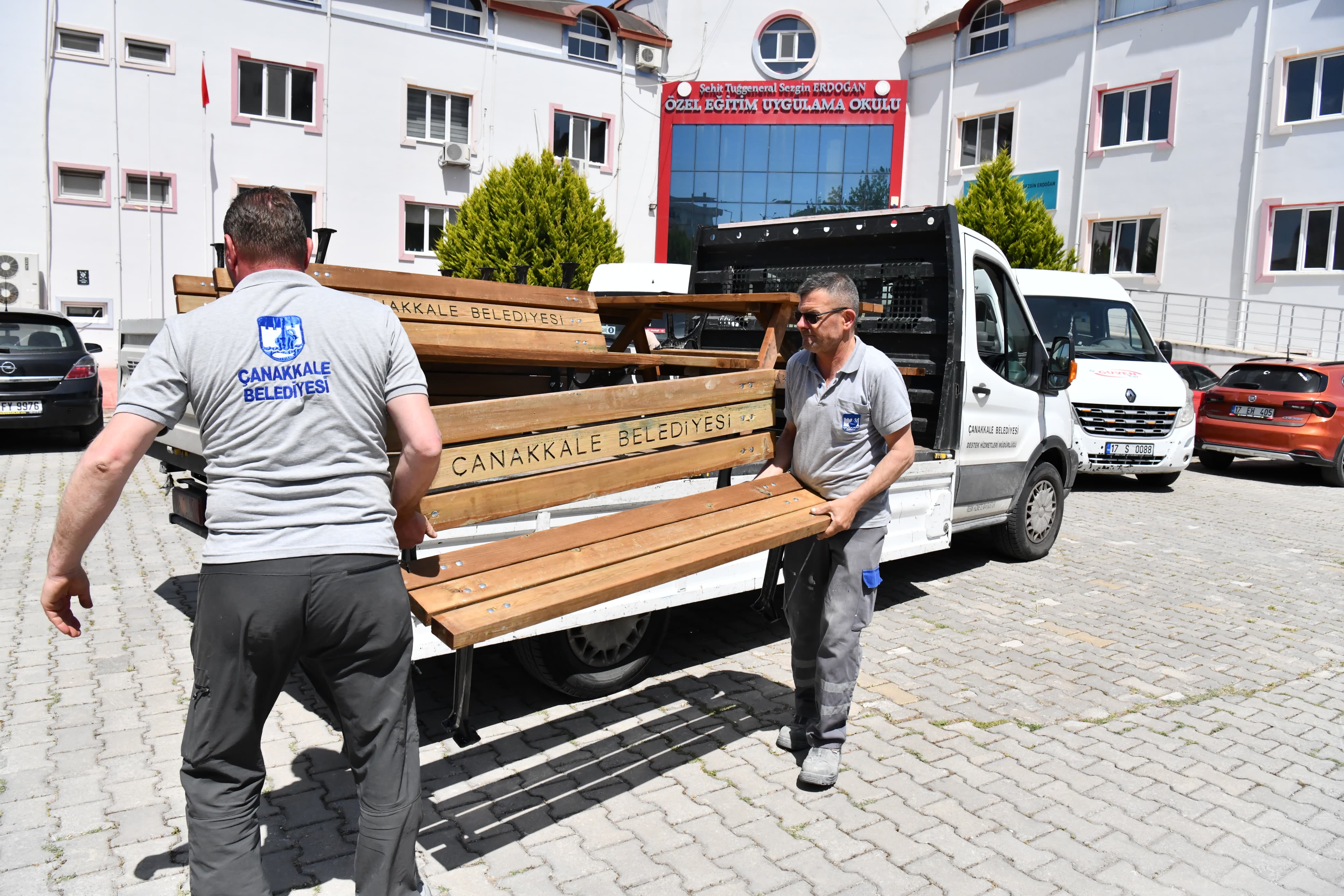 Çanakkale Belediyesi Destek Hizmetleri Müdürlüğü, okullara bank ve piknik masası desteği sağlamaya devam ediyor.