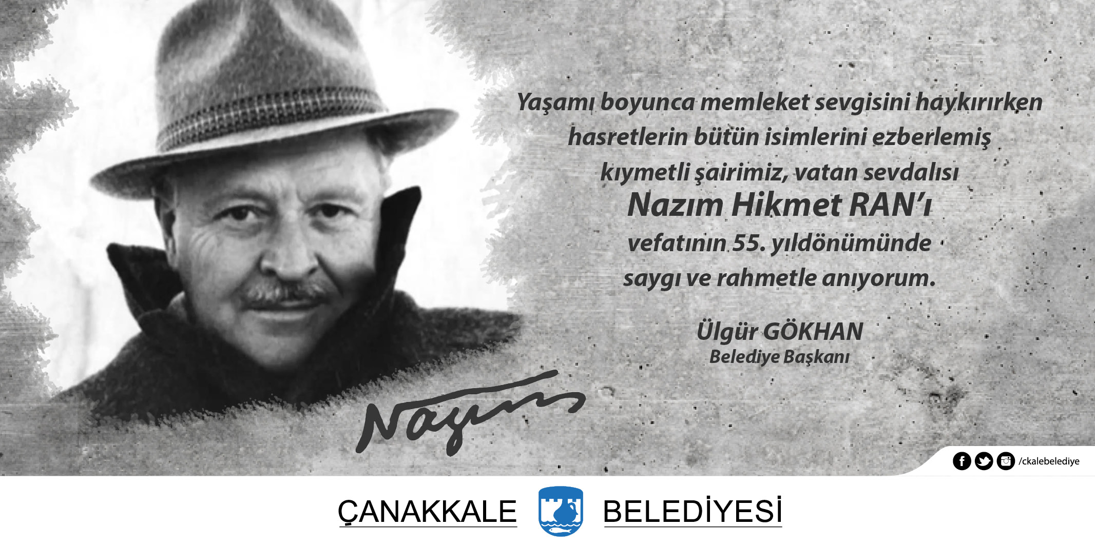 Düşünceleriyle ve kalemiyle, 55 yıl sonra bile her an, her saniye sevdalarımıza tercüman olmaya devam eden Nazım Hikmet RAN’ın fikirleri, şiirleri, vatana özlemle geçen ömrü bugün de barışın ve özgürlüklerin savunuculuğunu yapıyor, her türlü haksızlığın önünde duruyor.
