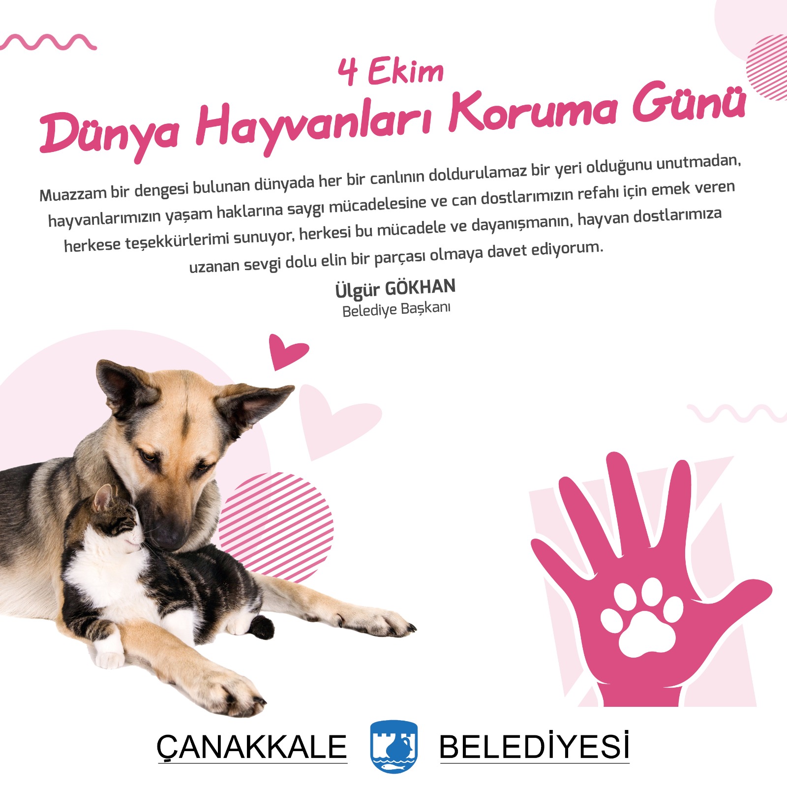 4 Ekim Dünya Hayvanları Koruma Günü dolayısıyla; muazzam bir dengesi bulunan dünyada her bir canlının doldurulamaz bir yeri olduğunu unutmadan, hayvanlarımızın yaşam haklarına saygı mücadelesine ve can dostlarımızın refahı için emek veren herkese teşekkürlerimi sunuyor, herkesi bu mücadele ve dayanışmanın, hayvan dostlarımıza uzanan sevgi dolu elin bir parçası olmaya davet ediyorum.