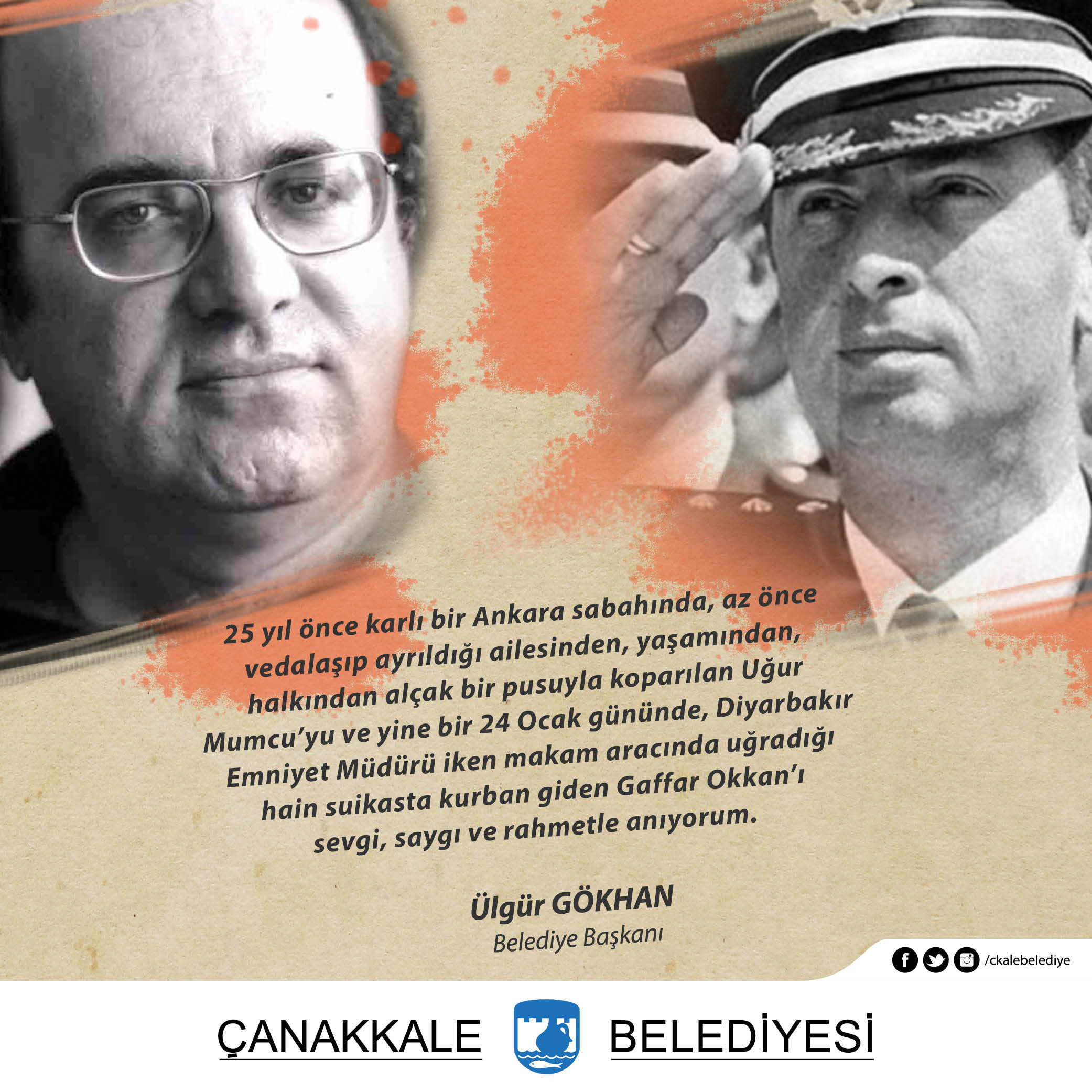 25 yıl önce karlı bir Ankara sabahında, az önce vedalaşıp ayrıldığı ailesinden, yaşamından, halkından alçak bir pusuyla koparılan Uğur Mumcu’yu ve yine bir 24 Ocak gününde, Diyarbakır Emniyet Müdürü iken makam aracında uğradığı hain suikasta kurban giden Gaffar Okkan’ı sevgi, saygı ve rahmetle anıyorum.